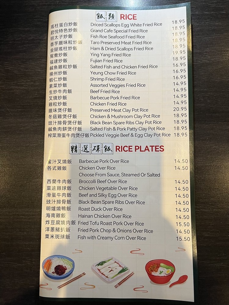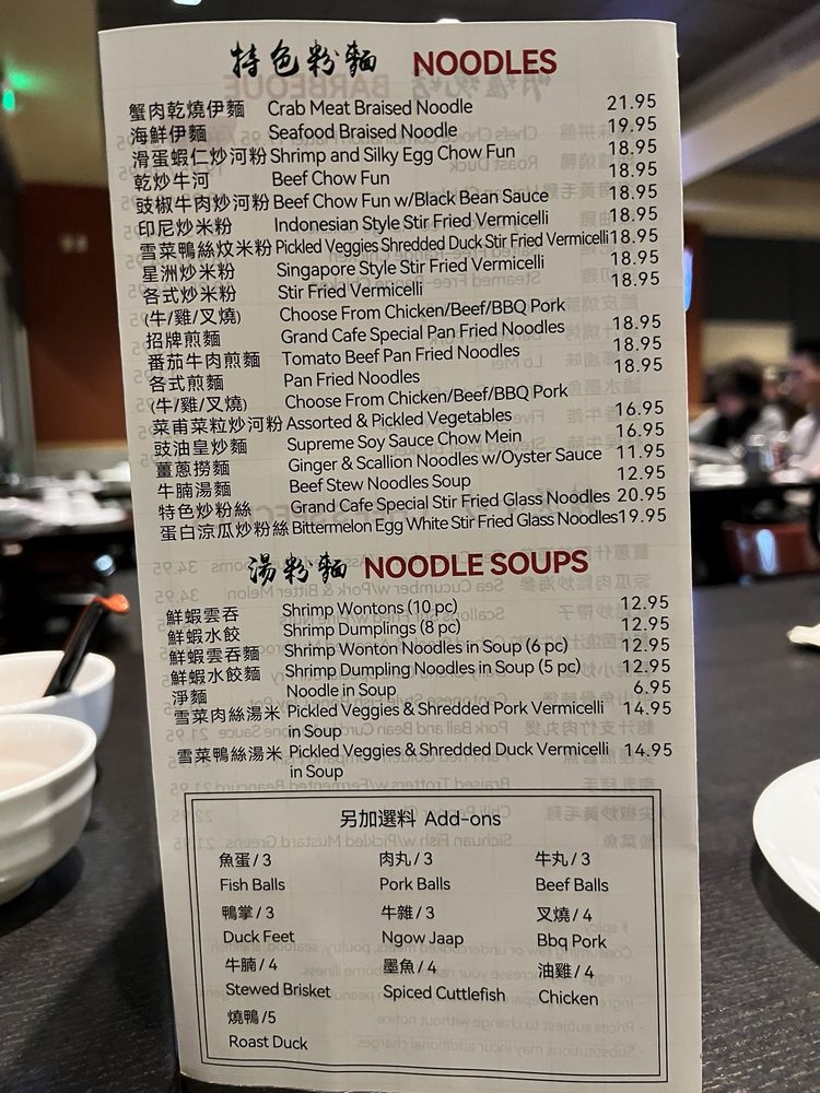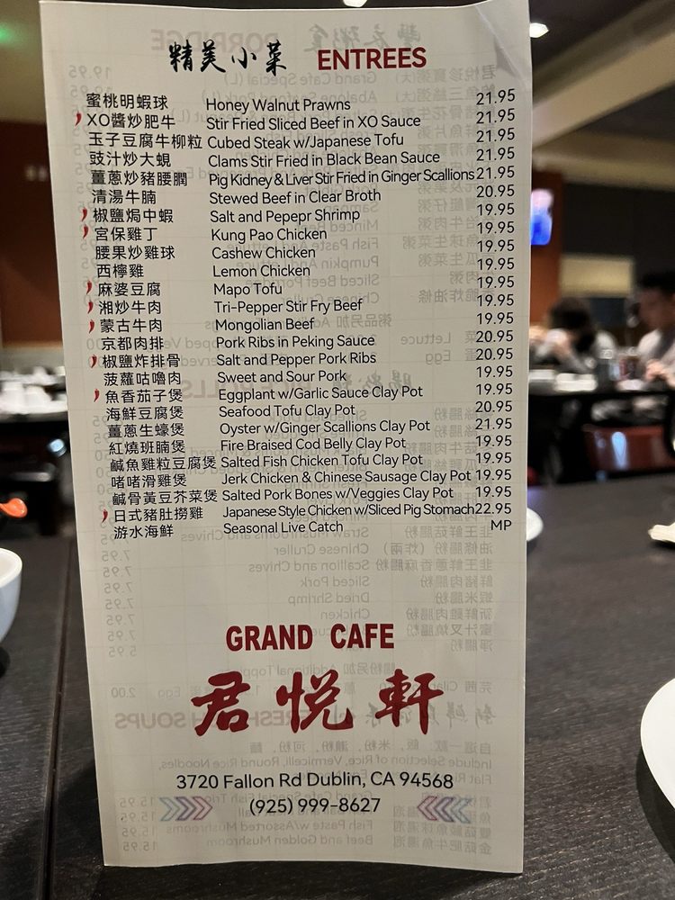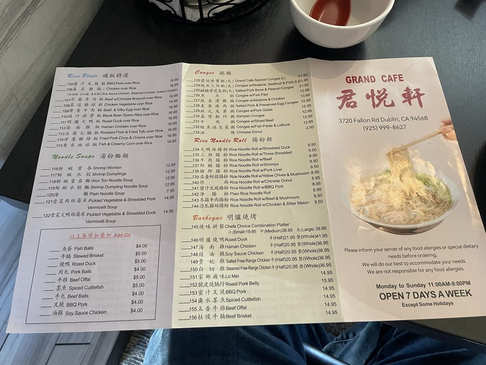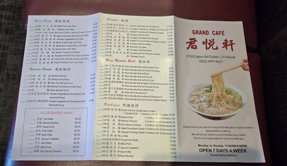 Introducing the menu at Grand Cafe, a Cantonese restaurant in Dublin, CA, featuring vegan and limited vegetarian options. Known for its good service and flavorful food, customers rave about the generous portions and authentic dishes. Standout items include shredded duck rice rolls, beef with egg & veggies, peas sprouts, salt and pepper tofu, and wonton soup with whole shrimp dumplings. The atmosphere is casual and welcoming, perfect for group dinners or solo meals. The wait staff is friendly and attentive, making every dining experience a pleasant one. With a private parking lot and outdoor seating available, Grand Cafe is a must-visit for those craving traditional Cantonese comfort food.